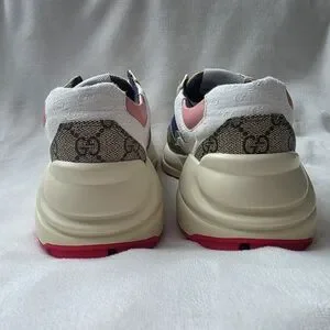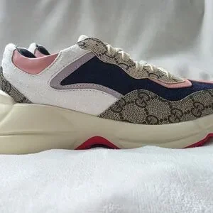 Stylish Gucci sneakers with pink, navy, and beige design. Features iconic logo pattern. Comfortable and trendy. These are NOT original, I ordered them through an App and the size was too small for me. I normally wear a size 7 (women's US) and these run a bit smaller.