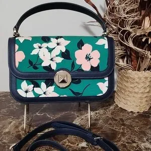 Chic floral Kate Spade 2way handbag featuring a vibrant design with navy leather trim and Silverhardware. Perfect for adding a touch of elegance to any outfit. EUC has 1 little nick on the bottom see pic. 9.5w x 10h inches without strap and 29.5h inch with Crossbody strap. Comes with Dustbag.