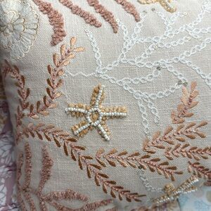 This gorgeous pillow is hand crafted w 3-D Effects- There are beaded starfish, hand embroidered nautilus appliqués, sequins adrift the abstract coral throughout!!