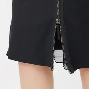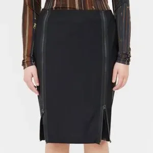 Jean Paul Gaultier black wool zip skirt. This knee-length pencil skirt features panel detailing at the front with oversized zip detailing and pull tabs. It has a back zip entry and is fully lined. The skirt is made from 100% virgin wool, with a 100% silk lining and was made in Italy. Front zippers can be adjusted to any height, the silk panels run the full length of the skirt.