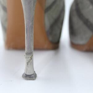 Note: The back of the one heel is scuffed and the material has separated. Rare find!