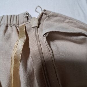 Elastic in the waistband in the back. Side zipper. There is supposed to be a hook and eye above the zipper but the hook is missing.