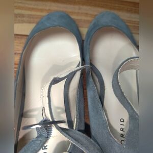 Torrid Gray Suede Ankle Strap Shoe Heel Pump. Pictured -Slight Tears on Both Insole New Looks Like Damage From Store. Buckle Ankle Strap. 2-in Heel