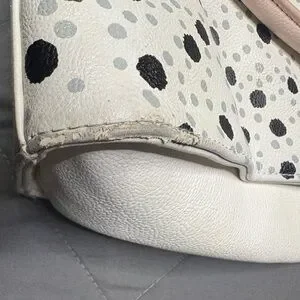 This stylish handbag features a playful polka dot design with elegant pink accents. Perfect for adding a touch of fun to any outfit.