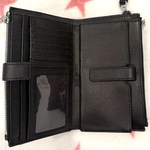 Very stylish & spacious. Fits phones. Double zipper compartments. 6 credit card slots. 1 window pocket. 3 slip pockets.