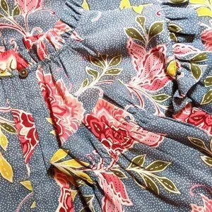 This brand new with tags (Never worn or used) feminine floral print blouse features a delicate gathered neckline w/ a ruffle trim collar, ruffles at the shoulders and upper sleeve & elasticized gathered cuffs. Split neck with button closure and a shirttail hem. Perfect for the season!