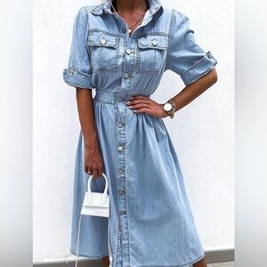 Elevate your casual wardrobe with this chic denim button-up shirt dress. Featuring a classic blue hue, this dress is perfect for any occasion. Style it with your favorite accessories for a complete look.