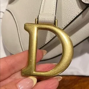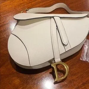 The Dior White Shoulder Bag showcases the iconic saddle shape, crafted from smooth leather with elegant contrast stitching. Its standout feature is the gold-tone 'D' stirrup hardware, adding a touch of luxury to this timeless design.