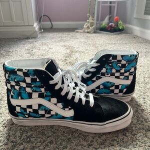 Black and white checkered with blue butterflies, high top vans tennis shoes