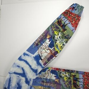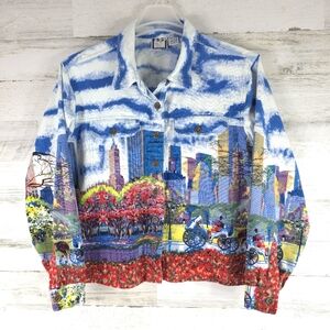 TAKE TWO Colorful Cityscape Denim Jacket WOMENS SIZE LARGE W/POCKETS 100% COTTON
