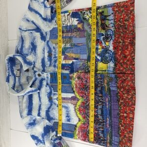 Vibrant denim jacket with a cityscape design. Features blue, red, and multicolor patterns. Eye-catching and unique style.