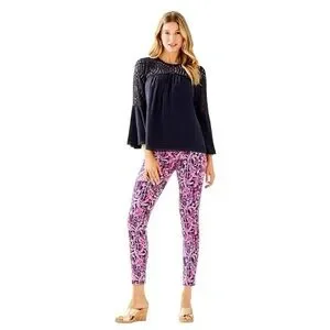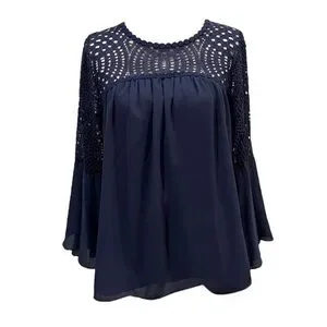 Lilly Pulitzer Amenna Flounce Sleeve Blouse in True Navy. Size 10. In excellent condition without tags. Long sleeve top with flounce sleeves and front & back lace/crochet yoke. Lileeze - 100% Polyester. Machine washable, lightweight, airy fabric resists wrinkles and maintains color fabulously. This blouse has a beautiful drape & keeps you comfortable from day to night.