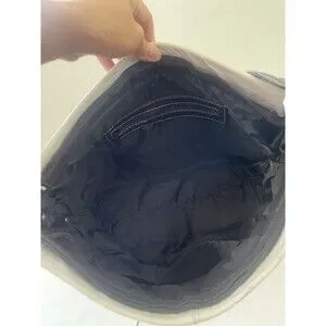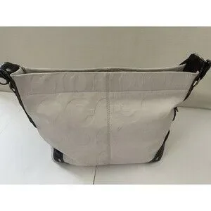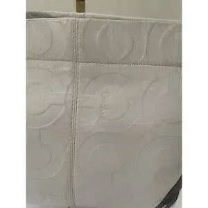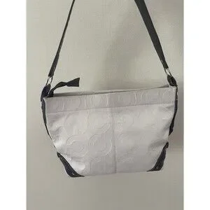 This Coach women's shoulder bag is a stylish accessory for any occasion. The bag features a white leather exterior with a dark brown leather shoulder strap. It has a zip closure and a rectangular shape, measuring 14 inches in width and 9.5 inches in height. The bag is adorned with a Coach logo pattern and has silver hardware accents.