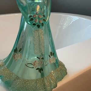 This exquisite Fenton glass art piece, beautiful bridesmaid, showcases a stunning green hue with a delicate iridescent shimmer.