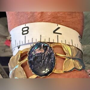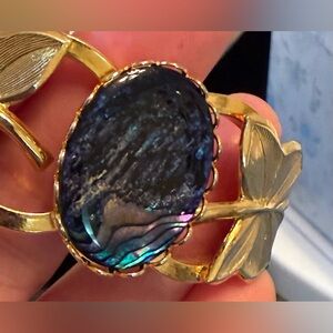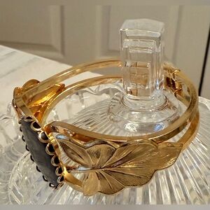 Elegant gold tone bracelet featuring Clamper Leaf designs and a striking Gemstone centerpiece.