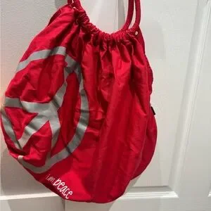 Peace, Love, World stylish red tote bag featuring a bold heart design. Perfect for adding a pop of color to any outfit. Fast shipping!!