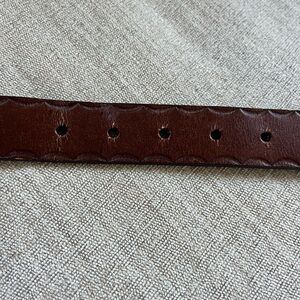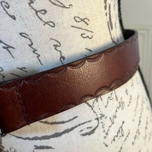 Give your wardrobe a splash of color with this beautiful brown leather belt with faux turquoise buckle and scallop design detail on edges. Approx. measurements: 40" length from end to end; 1 1/4" wide. The buckle measures 2 1/2" W x 2 1/4" H. Gently, pre-owned condition.