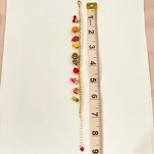 Super fun Piper K brand fruit charm bracelet, enameled metal fruits. Cherries, strawberry, dragonfruit, pomegranate, mango, grapes, orange, watermelon, pineapple, and apple with a red heart on end of chain. So fabulous! Chain clasp can be adjusted from approximately 7 inches to almost 9 inches diameter. No stretch. This is such a beautiful piece for summer! See the matching necklace in my shop and bundle three items for a discount!
