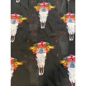 Preowned semi sheer cold shoulder tunic featuring boho chic bull pattern. Tunic length with elastic cuff sleeves, buttons at neck. *Medium: 29.5" / 19.25" 100% poly-chiffon. Features are buttons at back neck, elastic cuffs.