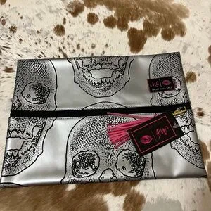 NWT Makeup Junkie Size Large Silver Skull Print Clutch