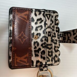 Stylish leopard print card holder with a convenient keychain. Features a chic design. perfect for keeping your essentials organized. The brown and black pattern adds a touch of elegance.