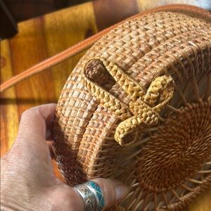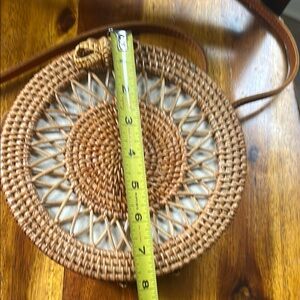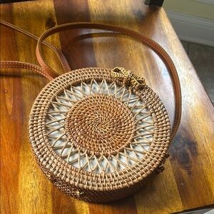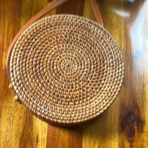 Stylish brown woven crossbody bag perfect for any occasion. Features a unique round design with a comfortable strap. Ideal for adding a touch of elegance to your outfit. All measurements in photos, barely if ever used, excellent condition
