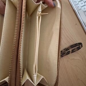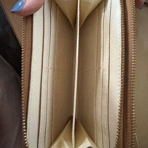 One Compartment is divided and contains spots for cards, bills and other items on both sides