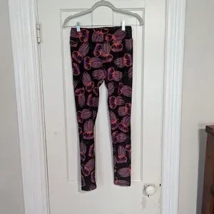 Vibrant LuLaRoe leggings with a colorful owl print pattern. Features shades of purple, pink, and orange on a black background. Perfect for adding a pop of color to any outfit. One size fits most