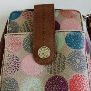 This is a faux leather, colorful Relic wallet wristlet. The exterior is very well worn. It measures about 4¾in.Wx7in.Hx1½in.D.