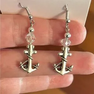 Elegant silver anchor earrings with crystal accents. Perfect for adding a nautical touch to any outfit.