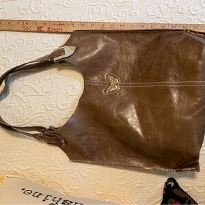 Hand tooled leather tote bag with handcrafted metal butterfly accent. Bag is very roomy, can hold your accessories and a bottle of water. Very durable and in excellent condition. Smoke free home. Bags at feel handmade.com