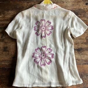 This is a gorgeous one of a kind reworked blouse by Bright Cloud Press! The original blouse is a beautiful, delicate Tommy Bahama silk button down. It was NWT never worn. Hand printed with antique German printing blocks and hand painted with non toxic textile inks. Tommy Bahama tag was removed for printing but shirt is brand new and has Bright Cloud Press tag.