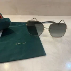 Stylish Gucci sunglasses with a sleek design. Comes with a matching case and pouch. Perfect for a chic look.