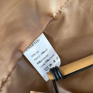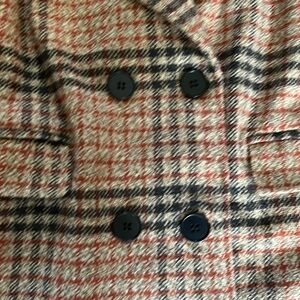 Lovely tan, camel with black and burnt orange plaid pattern. Classic turn down notch lapel collar. Two flap pockets. Knee length. Fully lined. Double breasted button front. Cute! Vintage vibes. Retro menswear inspired.