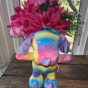 Vibrant plush dog toy with a rainbow of colors. Soft and cuddly, perfect for playtime.