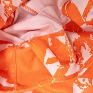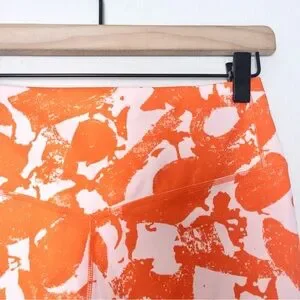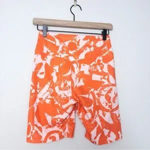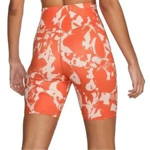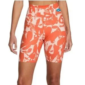 Vibrant orange bike shorts. Features bold pattern. Nike logo detail.