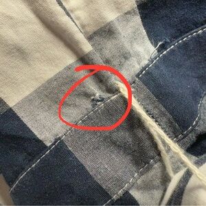 Minor faint spot on the end of the belt (please see pics; may come out with treatment as I haven't tried) and a tiny snag at the waist next to the belt loop. No other flaws and otherwise excellent pre-loved condition!