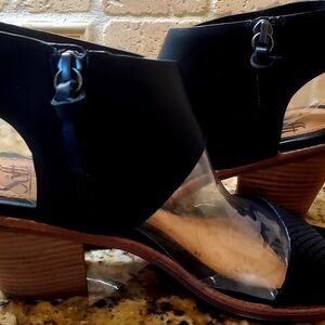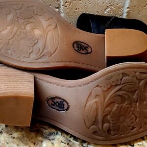 Step out in style with these elegant black leather Sofft Menaka block heeled sandals size 8M. Perfect for any occasion, these shoes offer both comfort and sophistication.