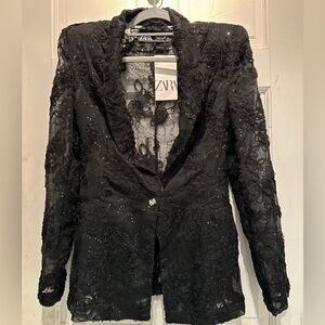 NEW ZARA Semi Sheer Structured Blazer w/ Sequins and 3D Flower Detail Size M/L