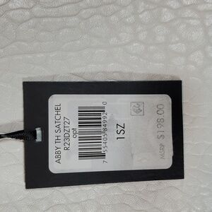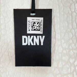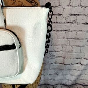 New Abby TH faux leather textured satchel by DKNY. White with black hardware. Detachable, adjustable shoulder strap with chain detail. Zipper closure. Two exterior zippered compartments. One interior zippered pocket and two interior non-zippered pockets. 100% Polyurethane.