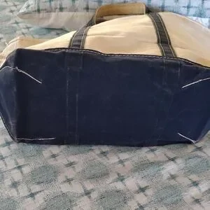 This L.L. Bean travel tote bag features a sleek tan and navy blue color scheme, perfect for any journey. Its structured form offers durability and ample space for your essentials, ensuring a reliable companion for both short and long trips.