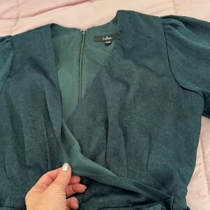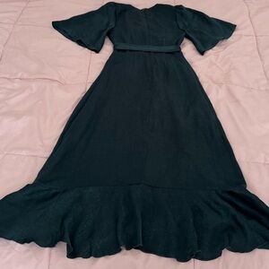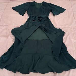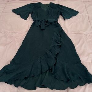 Lulus Wrapped Up in Love dark green faux wrap belted lined midi Dress, size XXS