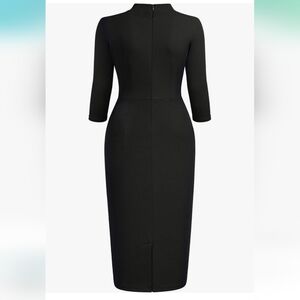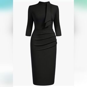 This Miusol sophisticated black sheath dress features a mock neck with a tie front detail and elegant ruching along the bodice. The 2/3 sleeves and form-fitting silhouette make it perfect for cocktail events or professional settings. Its timeless design ensures a polished and refined look.