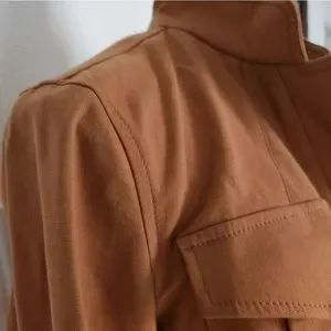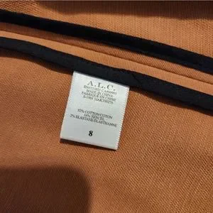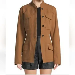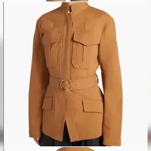 Stylish tan bomber jacket by A.L.C. Features a belted waist and front pockets. Perfect for a chic look.