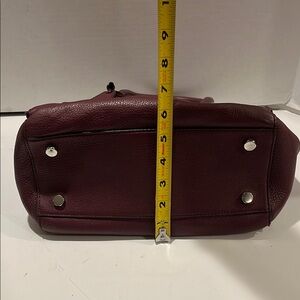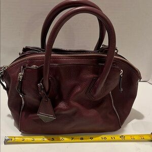 Discover the timeless elegance of the Rebecca Minkoff Mulberry Leather Satchel. Crafted with precision, this bag features a classic satchel shape and double top handles, making it a versatile choice for any occasion. Its rich mulberry (Burgandy)color adds a touch of sophistication to your everyday ensemble. Includes Rebecca Minkoff tag, detachable crossbody strap, 4 zippers to add extra expansion space. Inside black liner is clean, no stains or odor. One zip pocket and two slip pockets. Genuine leather. Fast shipping. See photo for measurements. Pet free smoke free home.