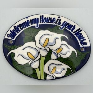 Mexican Folk Art Talavera Pottery Welcome Sign Wall Plaque Calla Lilies Handmade