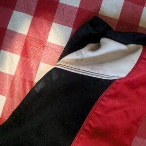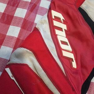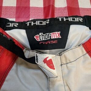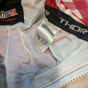 thormx phase motorcycle pants. size 32. red and black and white. significant staining and decent wear. some holes worn in. otherwise fully usable condition.