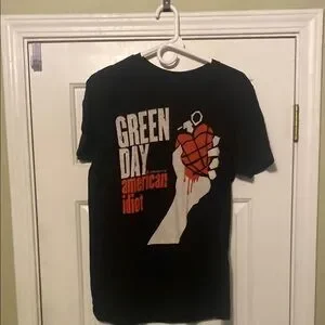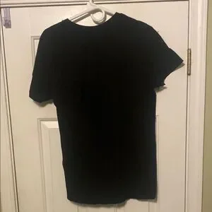 Black t-shirt featuring a bold graphic design in red and white. Size medium