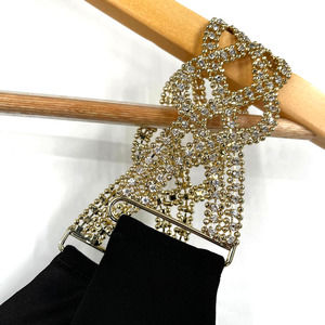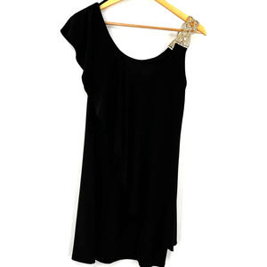 Graced by a cascading ruffle and a glittering rhinestone-studded shoulder, this jersey popover revamps the little black dress with pure glamour.