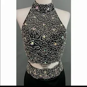 This stunning black evening gown features a sophisticated design perfect for formal occasions. The elegant silhouette and classic color make it a timeless addition to your wardrobe.